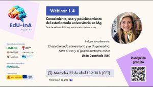 El miércoles 22 de abril de 2026 el proyecto EdU-InA organiza el seminario de difusión titulado "Conocimiento, uso y posicionamiento del estudiantado universitario en IAg". El encuentro se celebrará de 12:30 h a 14:00 h (CET) en formato...